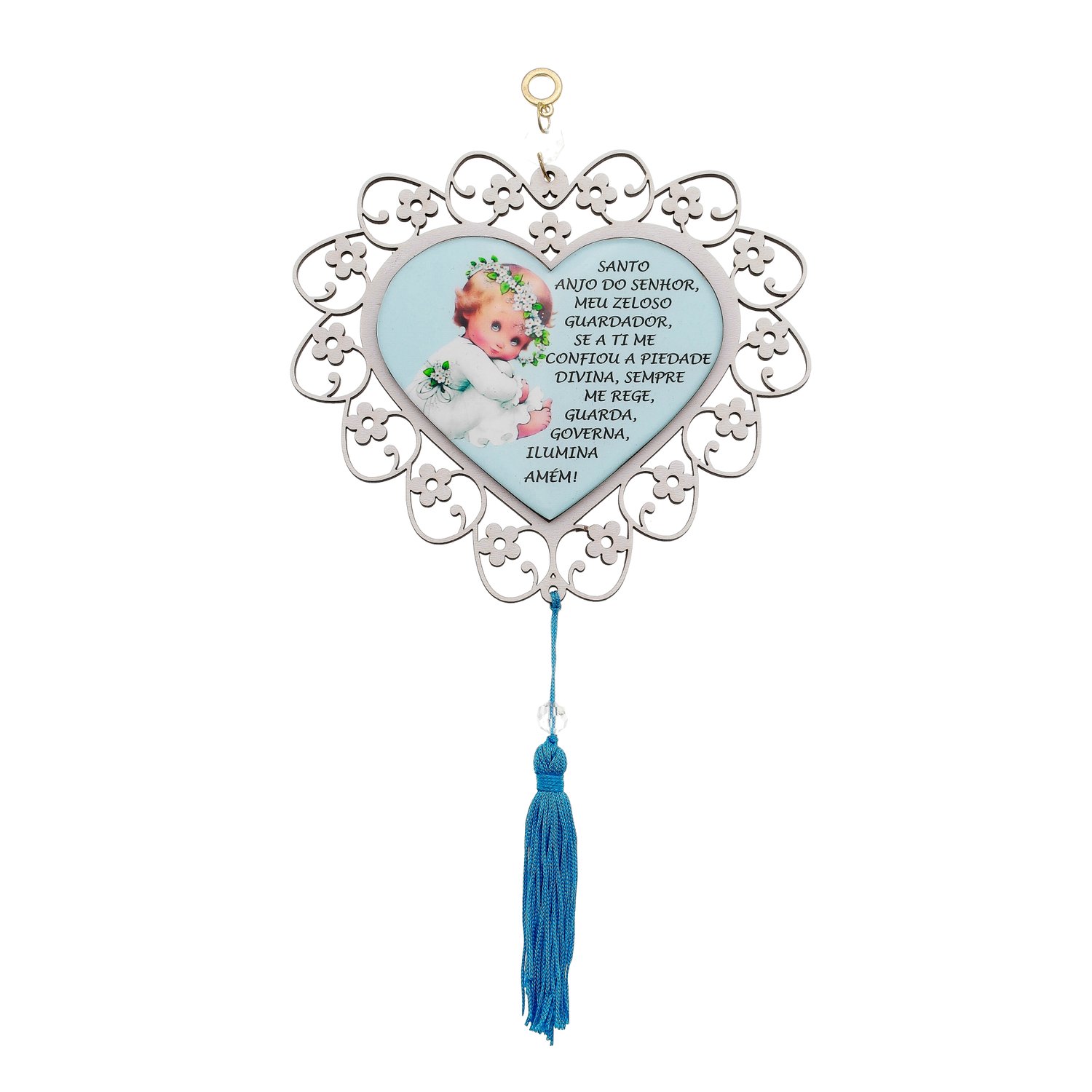 Adorno Anjo da guarda em formato de coração com imagem e oração do anjo da guarda.