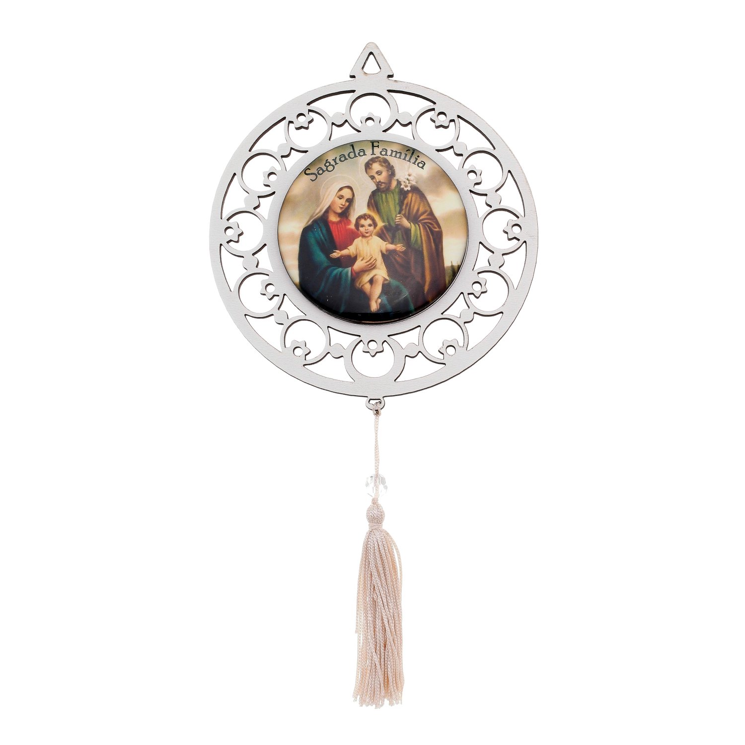 lindo adorno feito em madeira mdf no tamanho de 15cm redondo com uma linda imagem da Sagrada Família Resinada.