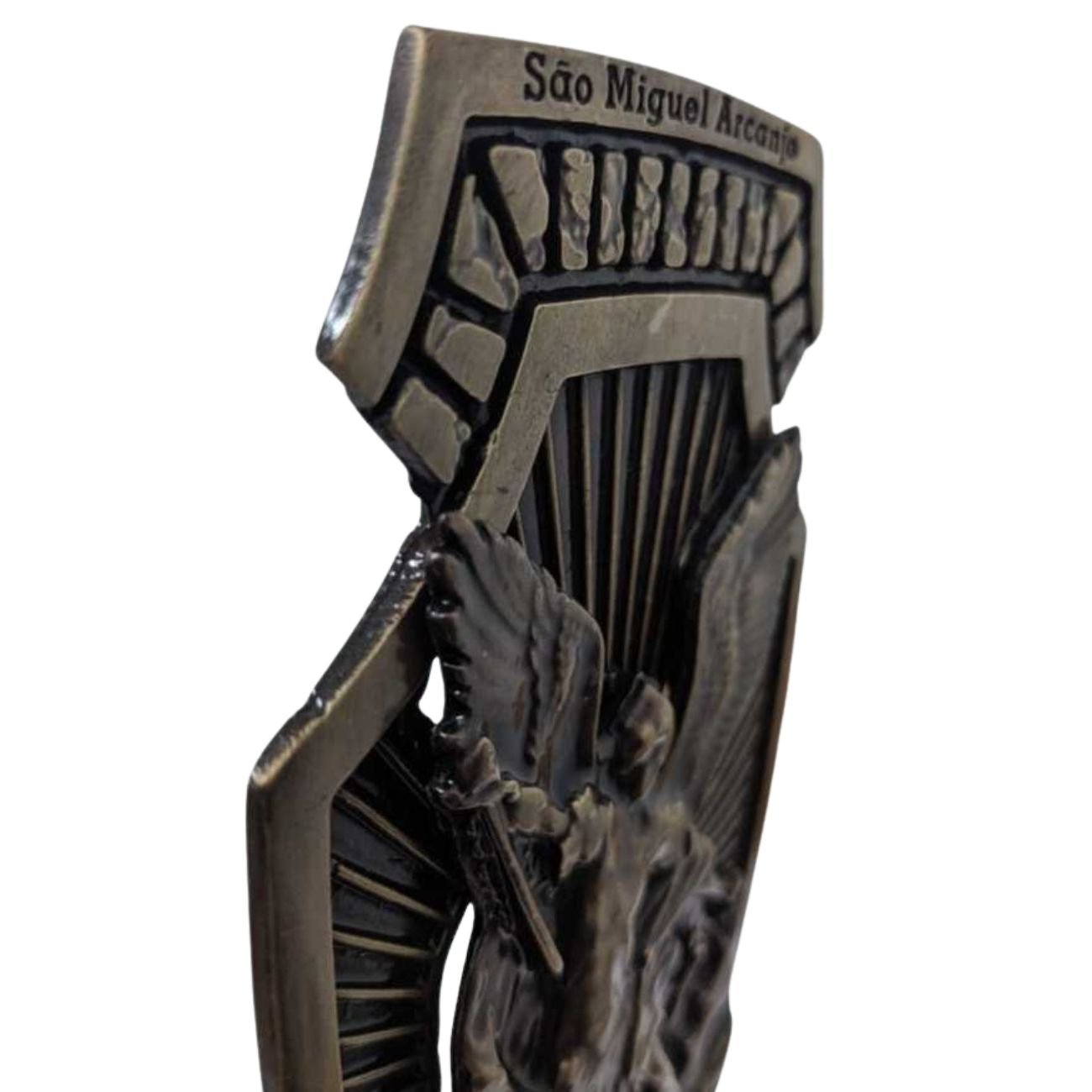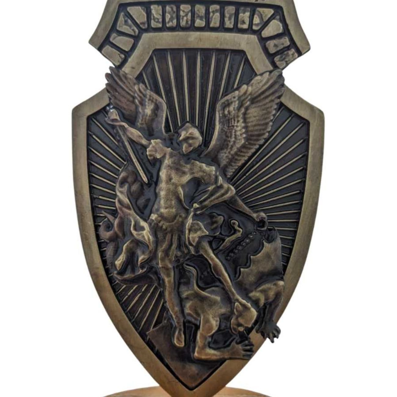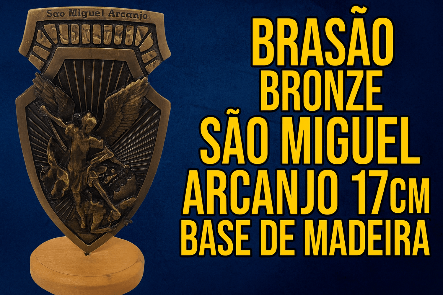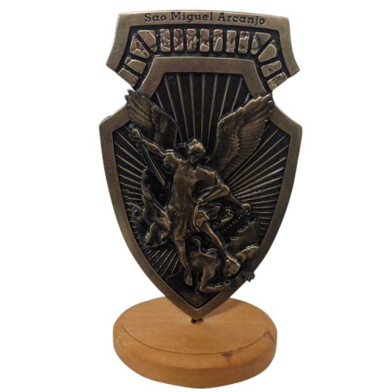 Peça resistente e de alta durabilidade, com bronze de ótima qualidade e base de madeira polida. O brasão apresenta relevo nítido, destacando os símbolos tradicionais de São Miguel Arcanjo. Ideal para escritórios, salas, altares e presentes religiosos. Produto artesanal que une elegância, fé e proteção.”