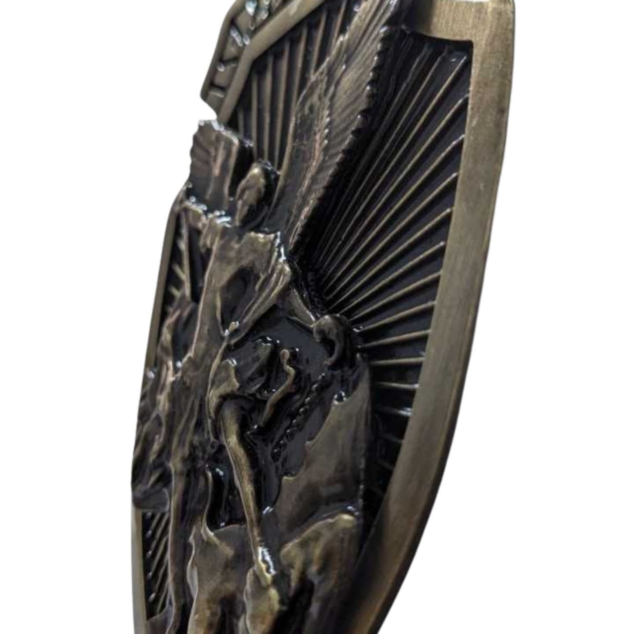 Brasão Bronze São Miguel Arcanjo 17cm base de madeira