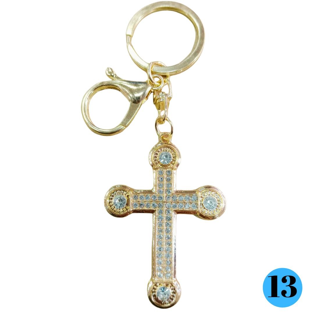 Lindo Chaveiro CRUZ feito em metal na cor Dourado com pedras de strass. Chaveiro belíssimo com mosquete e argola.
