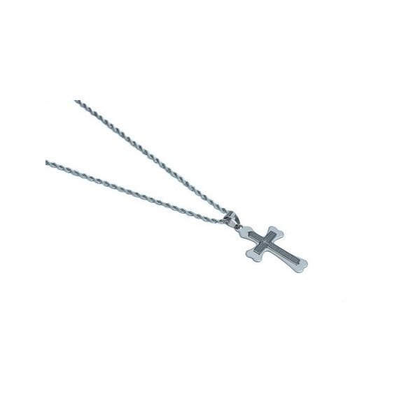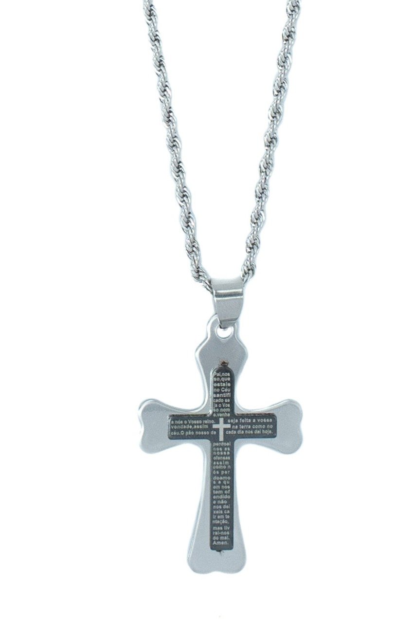 Corrente em Aço inoxidável modelo cordão 60cm com pingente de Cruz na cor preta e oração do pai nosso gravada a laser na cor prata.