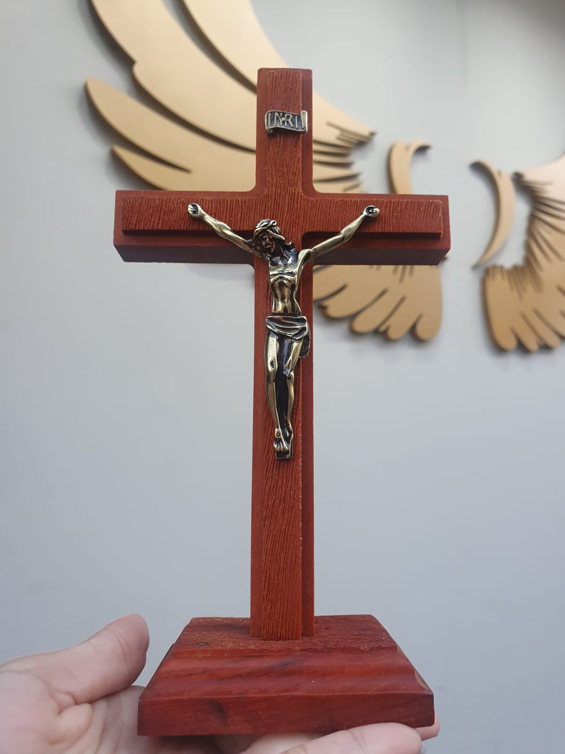 Lindo crucifixo feito em Madeira (Peroba). Com suporte para mesa, belíssimo detalhes em bronze. BASE REMOVÍVEL