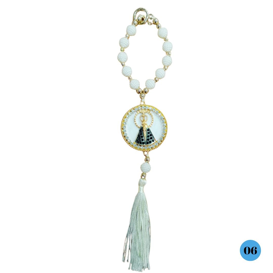 Linda Dezena para carro com contas imitando pérolas. Entremeio com medalha de São bento. Disponível em embalagem com 12 unidades.