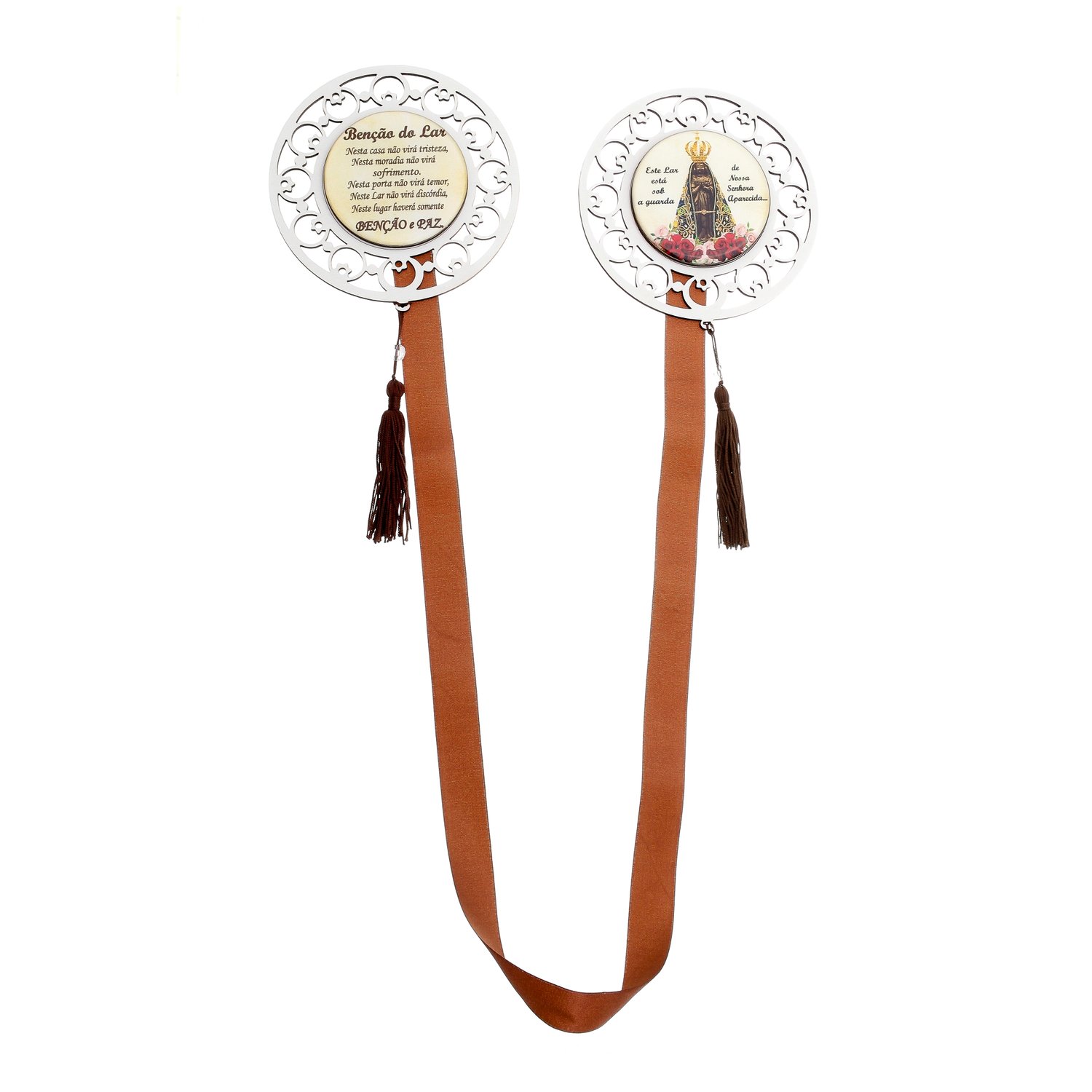 Fita de cetim, na cor marrom, medindo 2,5 cm de largura e, em média, 100 cm de comprimento.