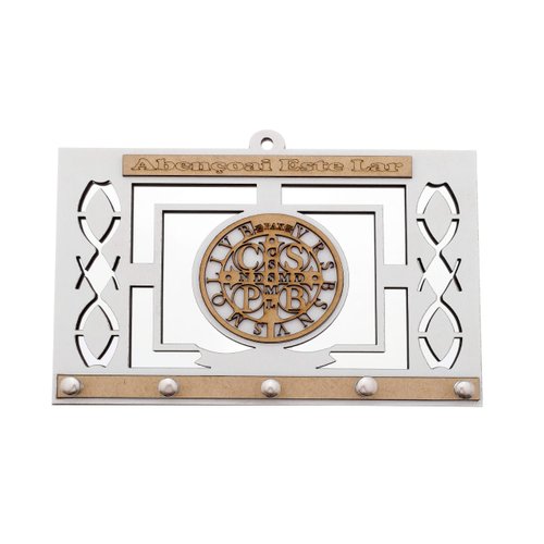 Porta Chaves de Madeira com Espelho e Imagem de São Bento em mdf estilizada. Disponível na cor branca e marrom.