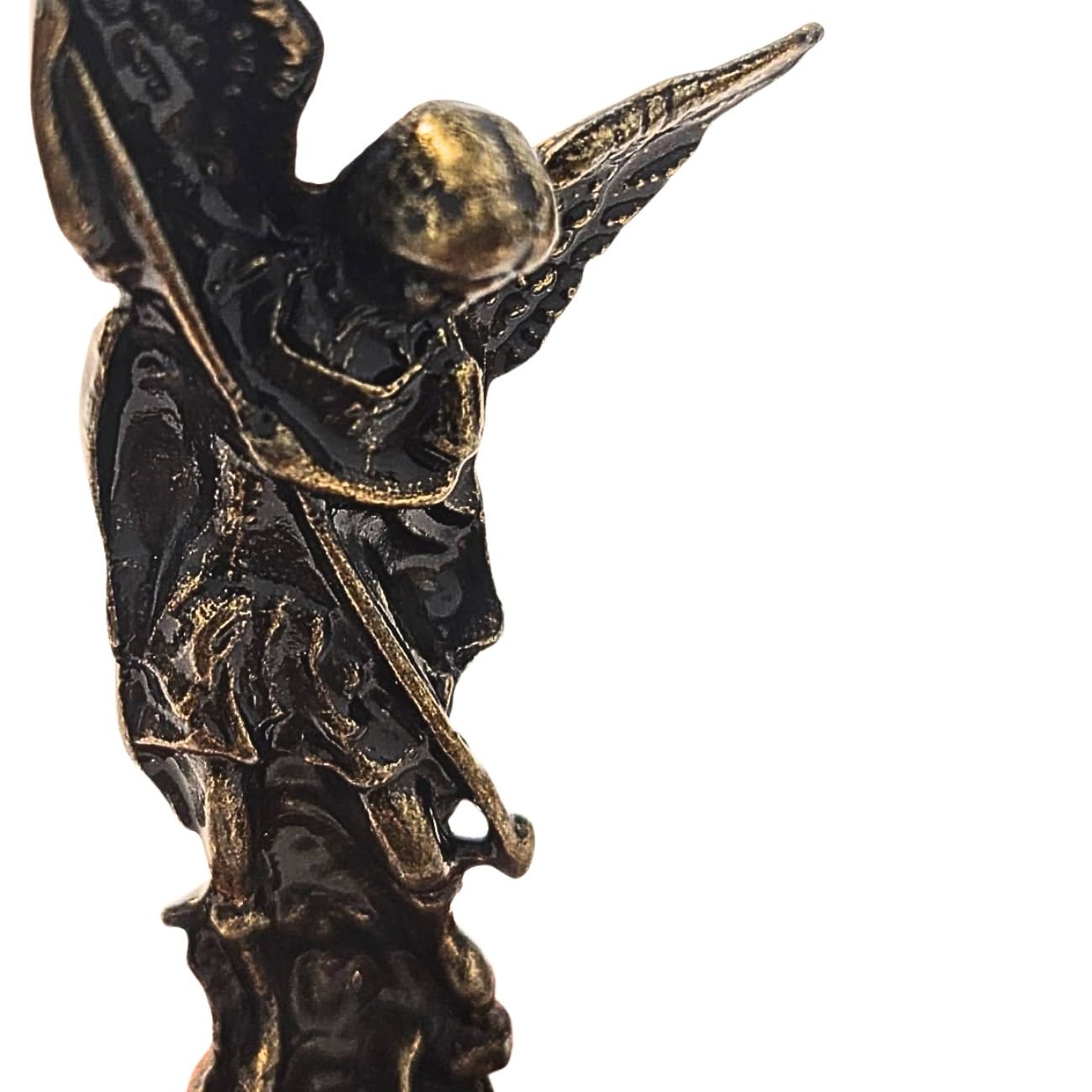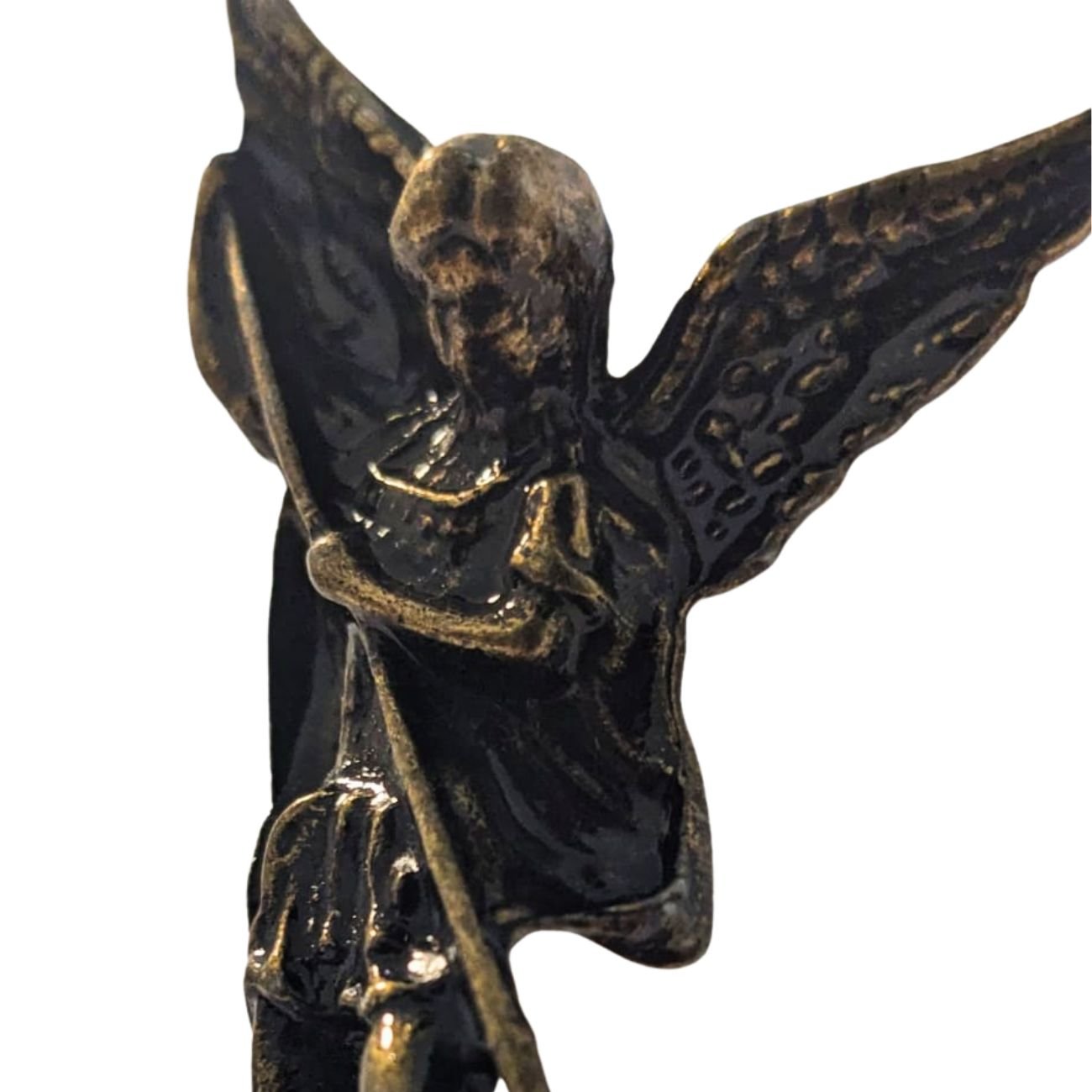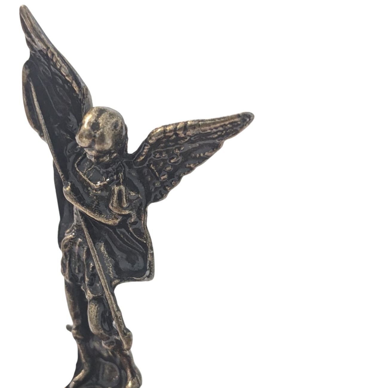 Material da imagem: Metal em tom escuro envelhecido, com detalhes bem definidos que destacam as asas, a espada e a postura firme de São Miguel Arcanjo.