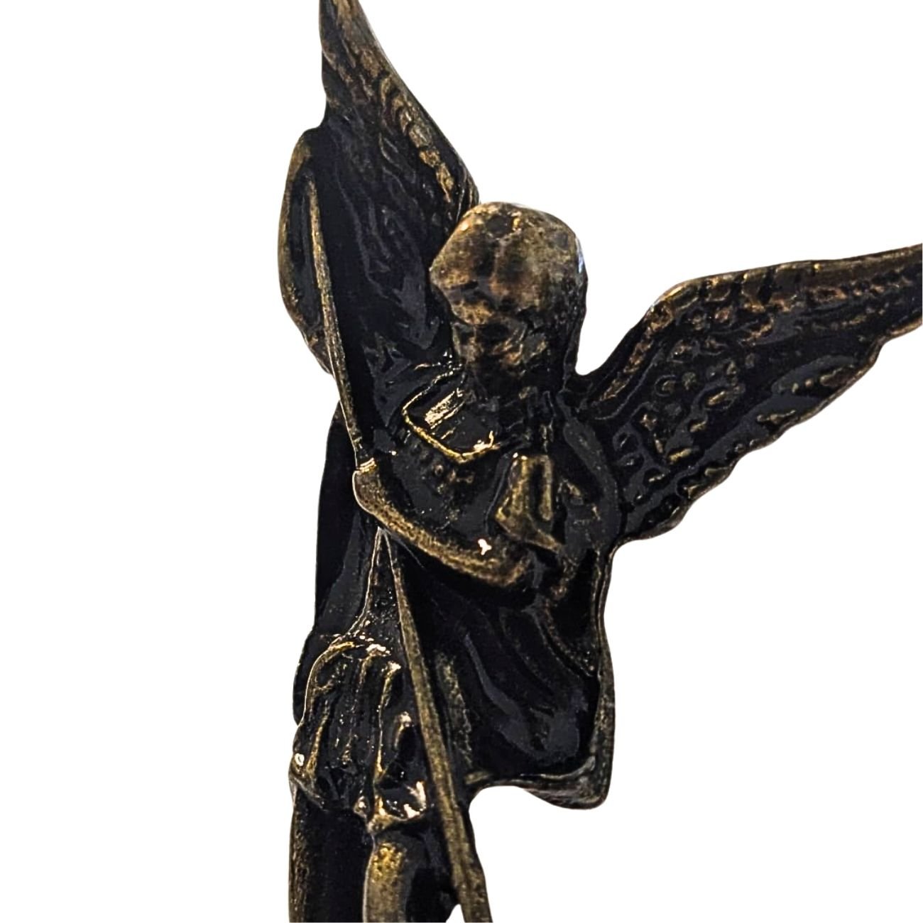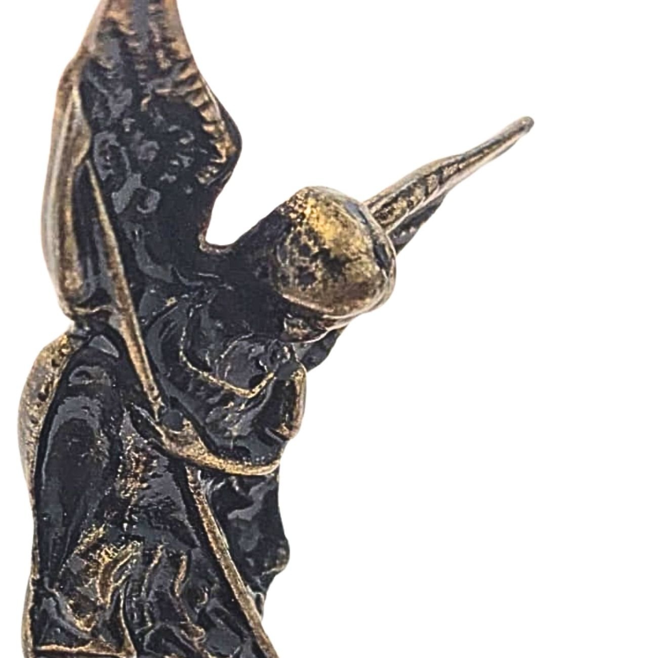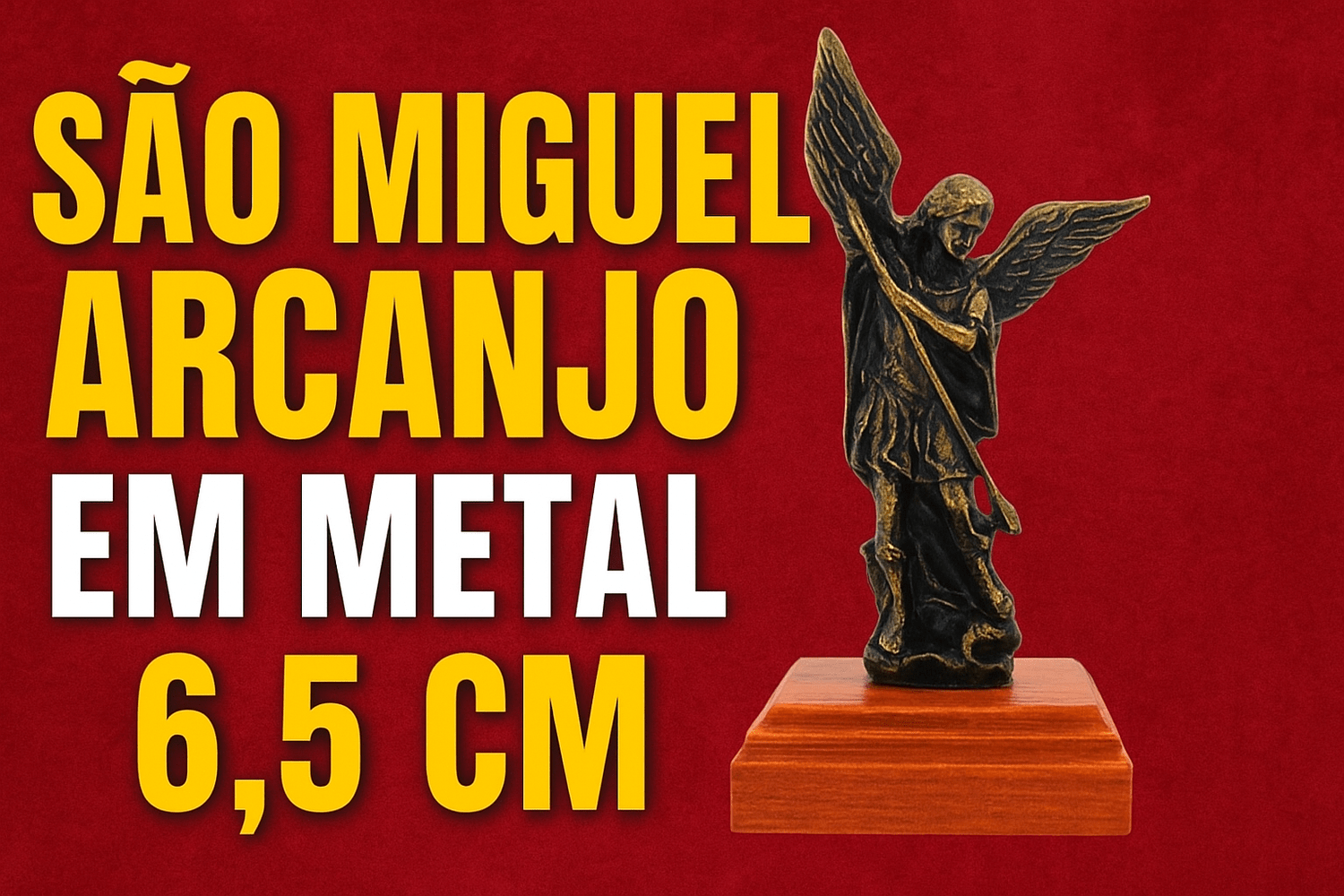 Material da imagem: Metal em tom escuro envelhecido, com detalhes bem definidos que destacam as asas, a espada e a postura firme de São Miguel Arcanjo.