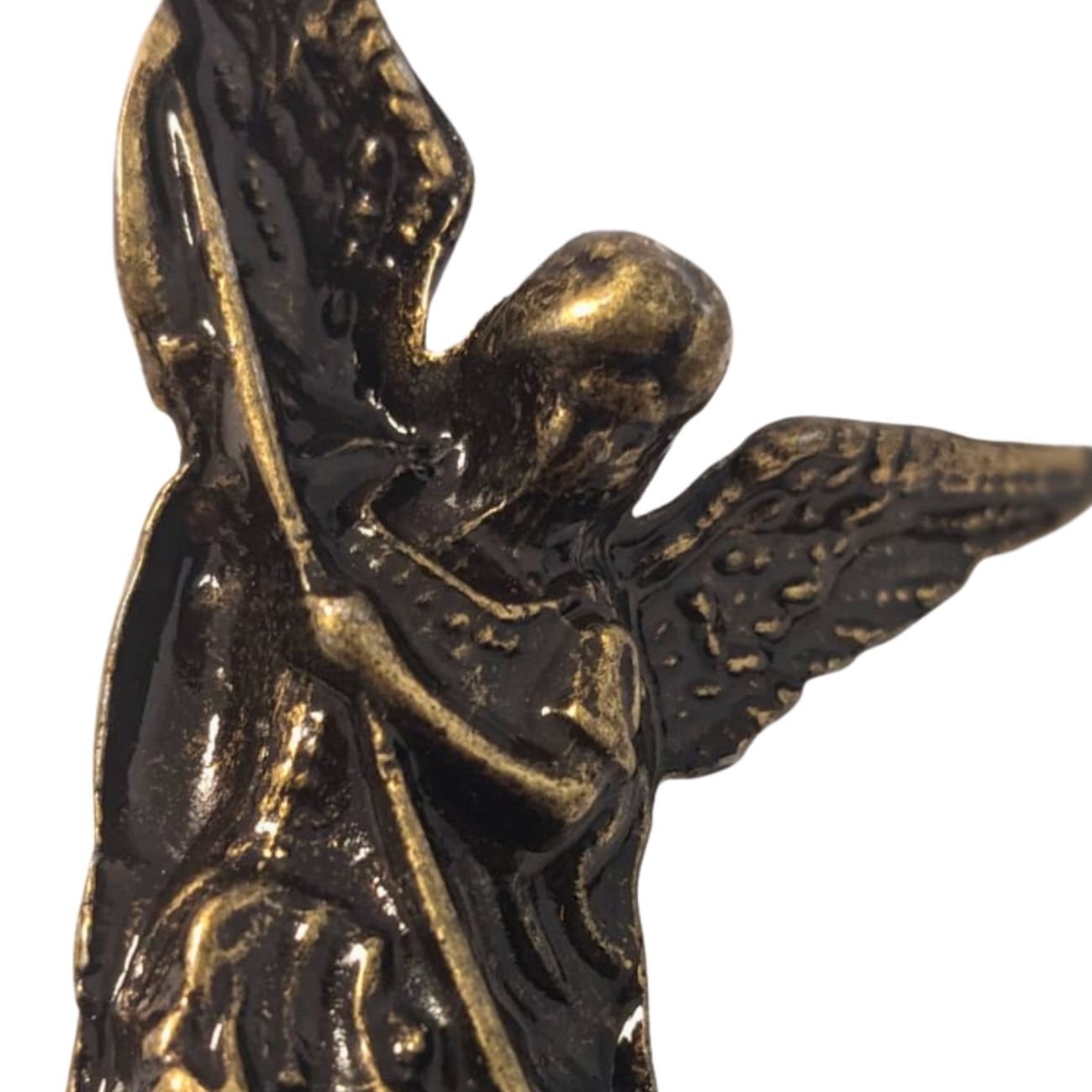 Design: A escultura apresenta o arcanjo em posição de ataque, simbolizando a vitória sobre o mal. O metal trabalhado ressalta o movimento das vestes e a imponência das asas.